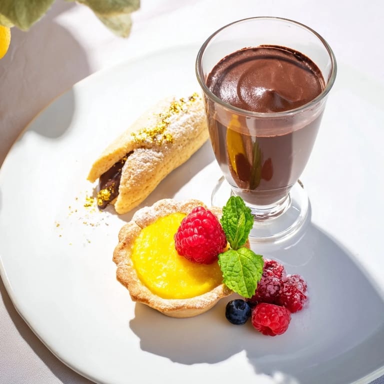- Place one chocolate mousse, one lemon tartlet, and one raspberry financier on each plate. Garnish with gold dust, fresh mint, and mixed berries for a sparkling effect.