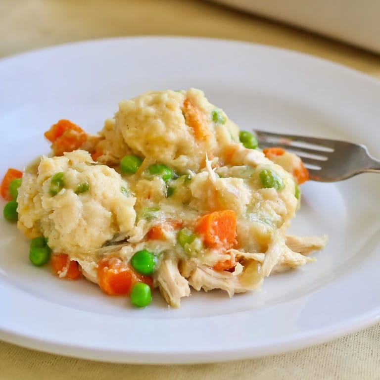 Save A comforting, hearty casserole combining tender chicken, vegetables, and fluffy dumplings baked in a creamy, savory sauce.