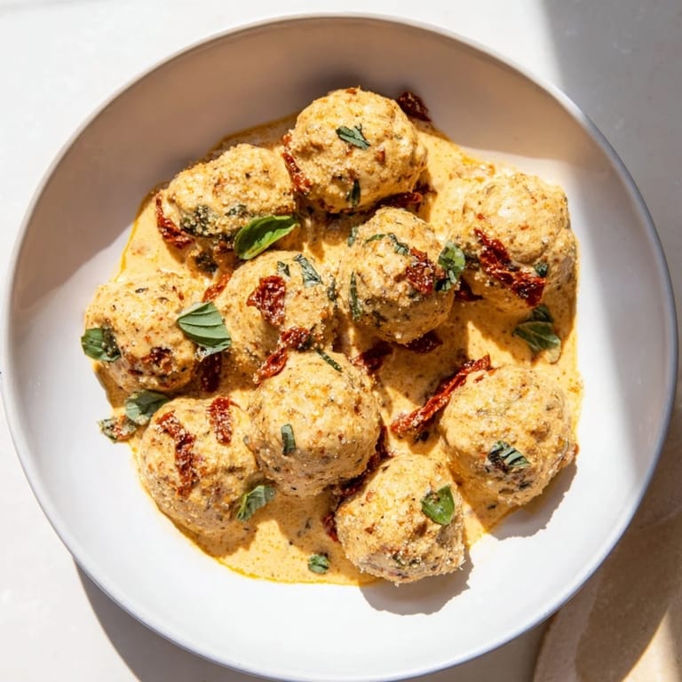 Save There's something about making meatballs that feels like you're building something small but mighty. My friend texted me one evening asking if I could bring dinner to her place—something that would make her new partner think she'd been cooking all day. I reached for chicken instead of the usual beef, and that's when the sun-dried tomatoes caught my eye in the pantry. The combination felt luxurious without requiring hours of work, and when those cream-colored sauce bubbled up around the tender meatballs, even I was convinced it was impressive.