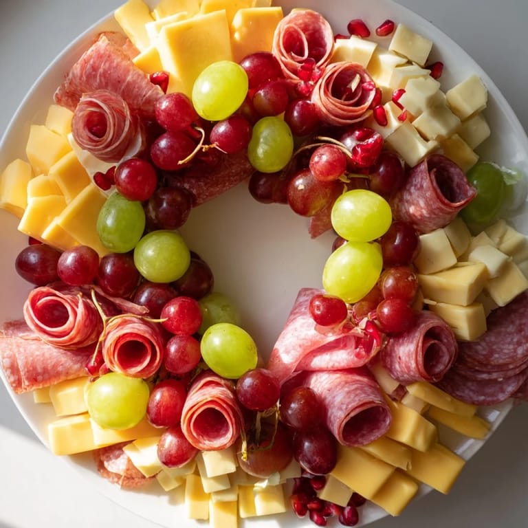 To enhance the wreath’s aroma and festive look, fresh rosemary and thyme sprigs are essential. Assemble the board close to serving time to keep fruits fresh and crackers crisp. Use small forks or tongs for easier serving. For a neat presentation, keep cheese and meats in tidy clusters and balance colorful fruits evenly throughout.