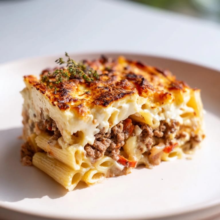 Save A classic Greek casserole featuring layers of tubular pasta, savory spiced beef, and creamy béchamel sauce, baked to golden perfection.