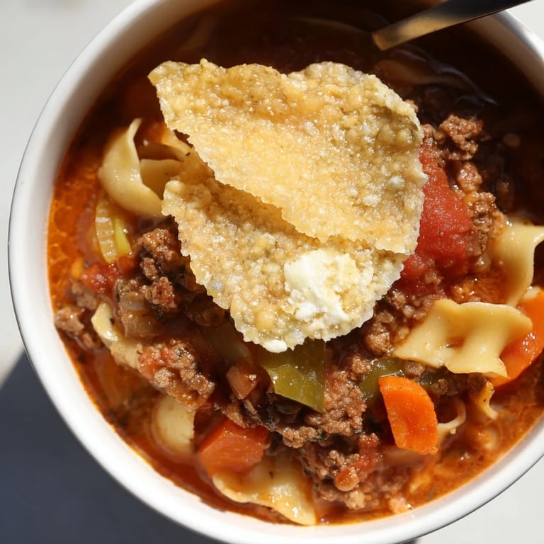 Save A hearty, comforting soup inspired by classic lasagne, featuring rich tomato broth, tender pasta, and a crunchy Parmesan crisp topping.