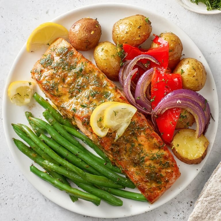Save A vibrant, healthy sheet pan meal featuring tender salmon fillets, crispy roasted potatoes, and fresh seasonal vegetables, all infused with zesty lemon and aromatic herbs.