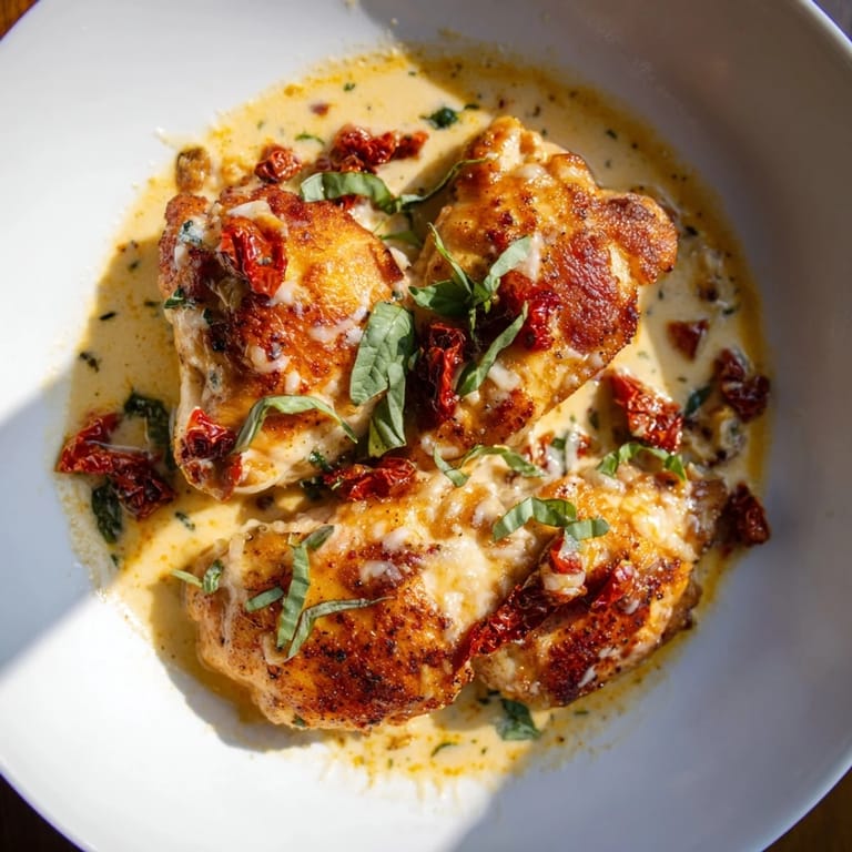 Save Tender, juicy chicken thighs simmered in a creamy sun-dried tomato sauce with garlic and Parmesan, perfect for a quick and romantic weeknight dinner.