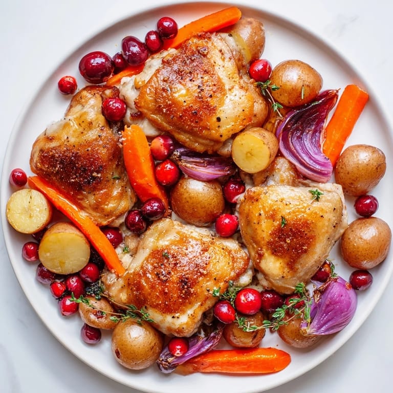 Cranberries add a sweet-tart brightness that balances the rich, savory notes of the roasted chicken and vegetables.