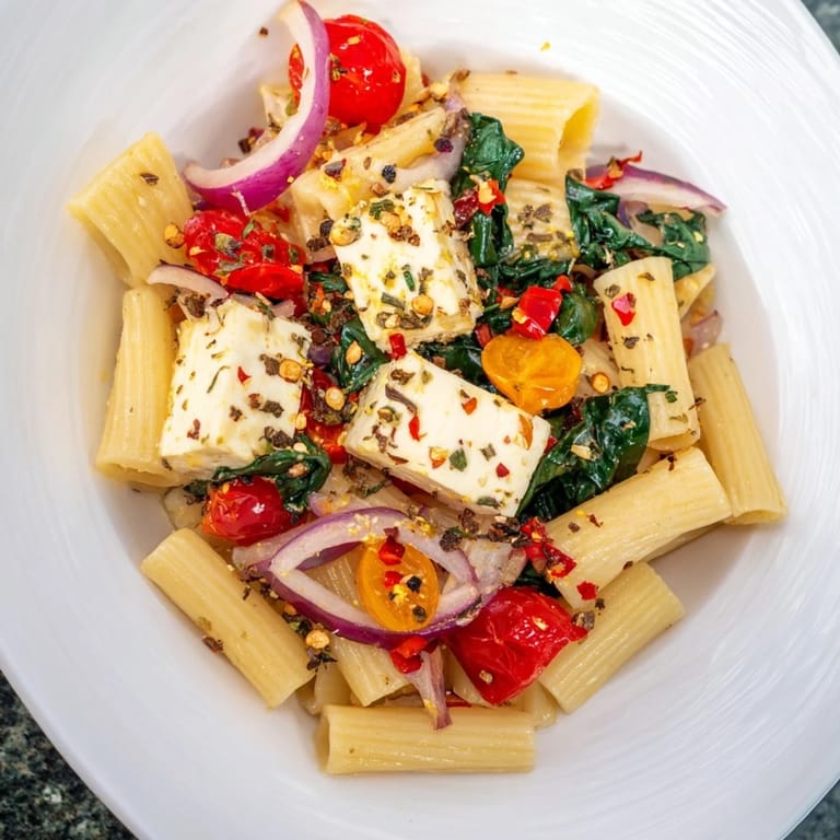 It’s best enjoyed fresh, but the baked feta and vegetables can be reheated gently and combined with freshly cooked pasta.