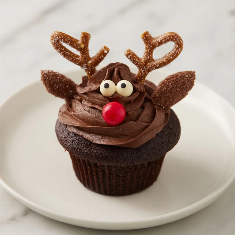 - Assemble cupcakes: Frost each cupcake with chocolate frosting. Insert gingerbread antlers (or pretzels), add candy eyes and red nose.