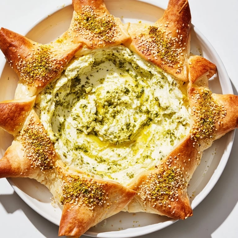 Save Bring a touch of festive elegance to your next gathering with this Star-Shaped Pesto Dip with Cracker Edges. The vibrant green pesto filling sits beautifully nestled within a golden, flaky puff pastry star, creating a perfect harmony of creamy and crispy textures. Whether you're hosting a holiday party or simply want a crowd-pleasing appetizer, this Italian-inspired dish combines simplicity and charm effortlessly.