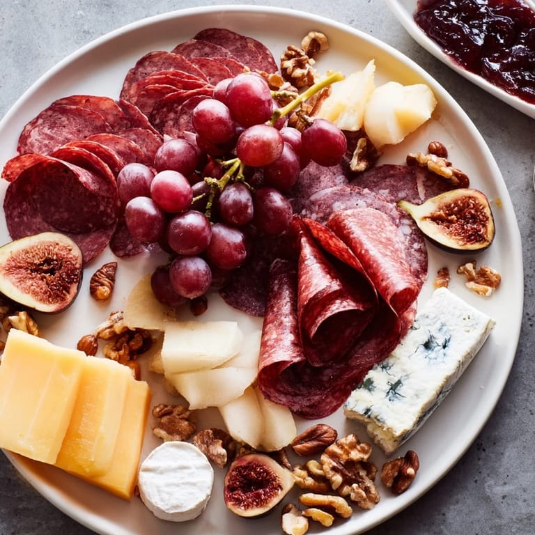 - Nuts & Accompaniments: 40 g toasted walnuts, 40 g marcona almonds, 2 tbsp wildflower honey, 2 tbsp fig jam, Cornichons and pickled onions to taste, Assorted olives