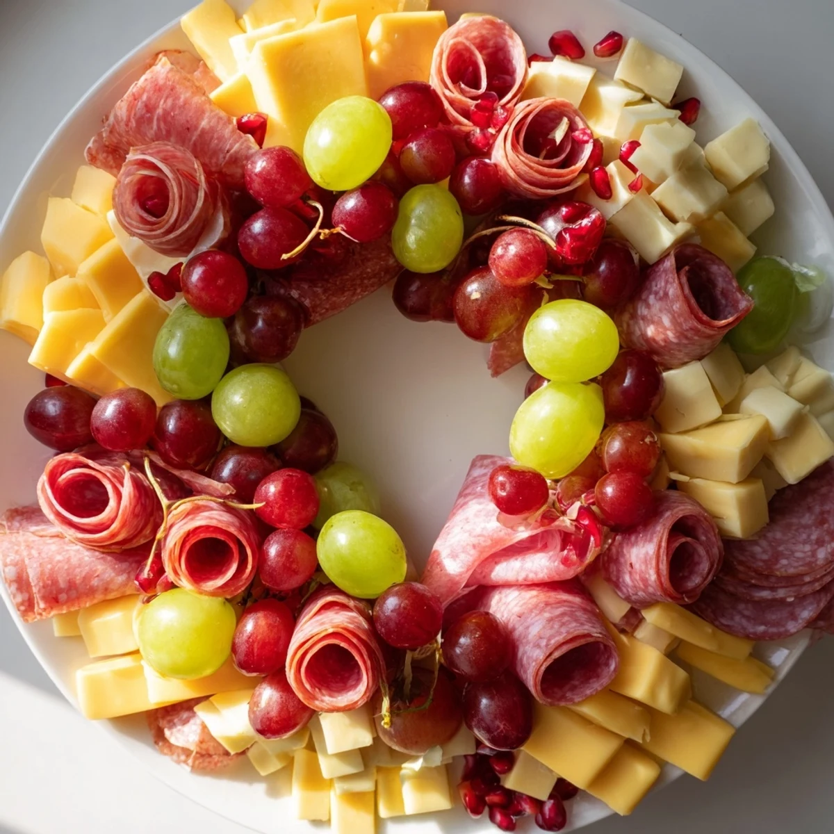 - 5. Scatter grapes, cherry tomatoes, cucumber rounds, and pomegranate seeds around the wreath, filling in gaps and adding color.
