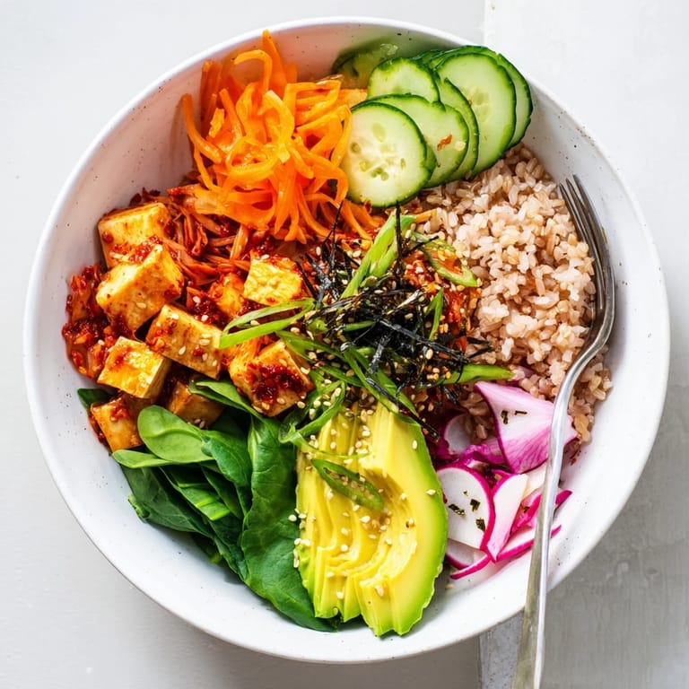 Save A vibrant nourishing bowl featuring tangy kimchi fresh seasonal vegetables hearty grains and a flavorful dressing is perfect for a wholesome lunch or dinner.