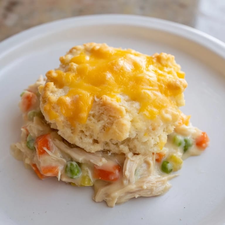 Save A comforting, savory casserole featuring tender chicken and vegetables in a creamy sauce, topped with golden, cheesy cheddar biscuits all baked together in one pan for easy cleanup.